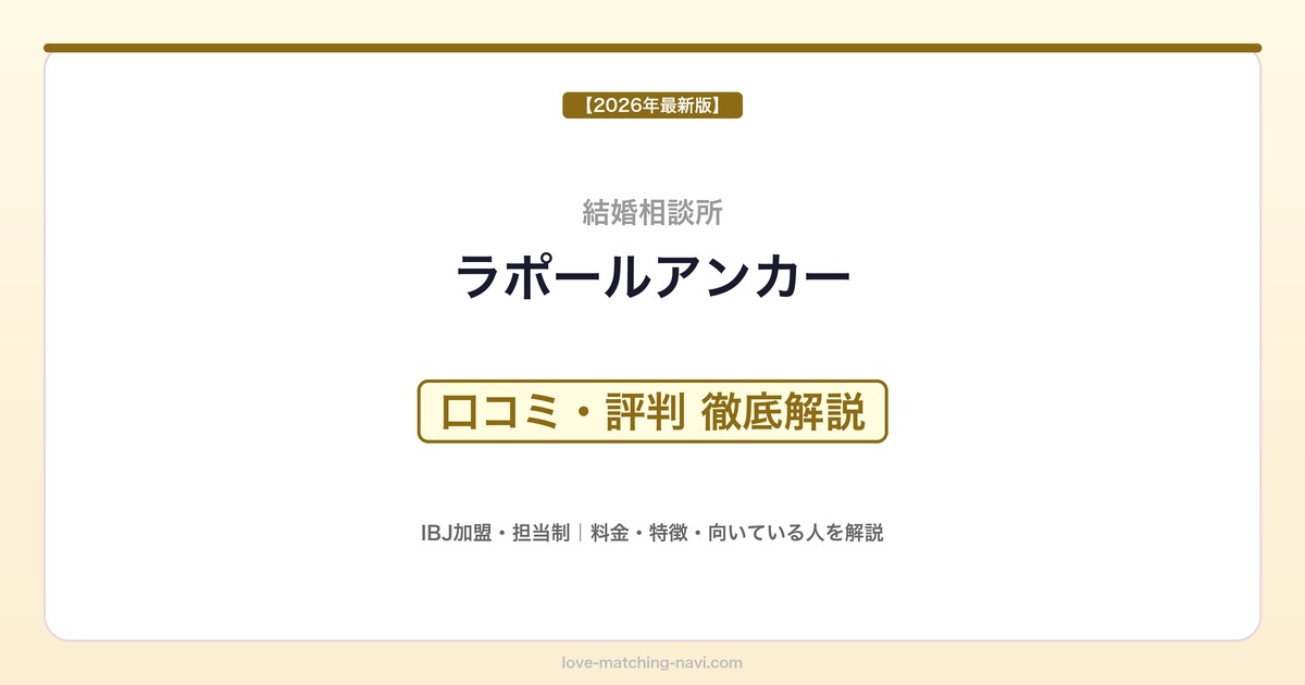 ラポールアンカーはIBJ(日本結婚相談所連盟)に加盟した結婚相談所で、専任カウンセラーによるサポートと全国規模の会員ネットワークが特徴です。マッチングアプリとは異なり、成婚を真剣に目指す方を対象としたサービスです。
