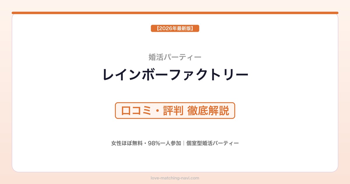 レインボーファクトリーは、女性ほぼ無料・個室型・98%一人参加という婚活初心者でも参加しやすい環境が整った婚活パーティーサービスです。マッチングアプリのメッセージに疲れた方や、まず直接会って判断したい方に特におすすめです。