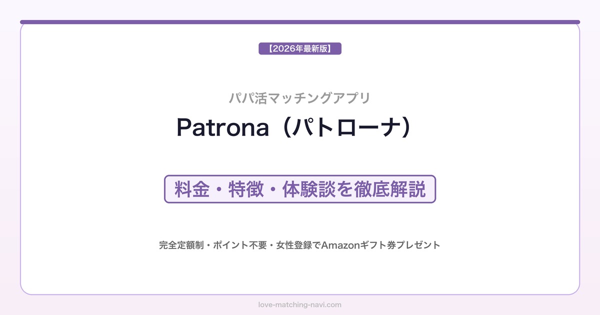 Patrona(パトローナ)は、完全定額制・ポイント不要のパパ活専用マッチングアプリです。男性は月額3,000円のみで全機能が使い放題。女性は完全無料で登録でき、年齢確認を完了するとAmazonギフト券1,000円分がもらえる特典もあります。「追加課金なしで気軽に始めたい」という方にぴったりのサービスです。