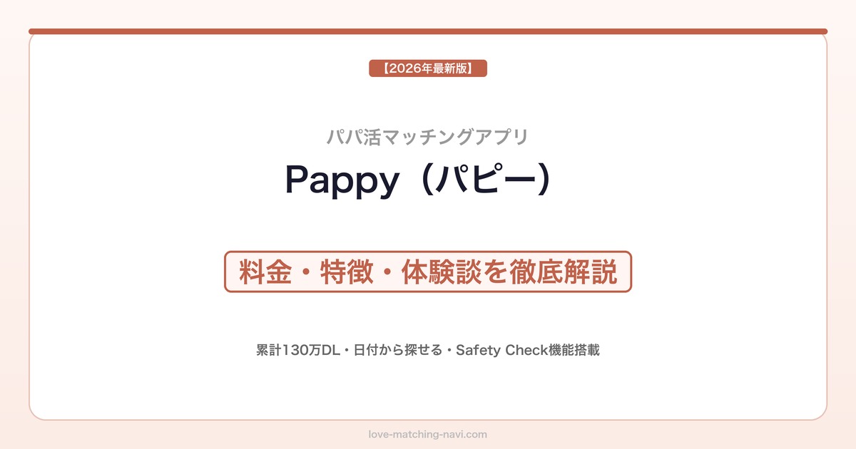 Pappyは累計130万ダウンロードを突破した人気パパ活マッチングアプリ。「日付から探す」という独自機能で自分の空いた日程に会える相手を探せるのが特徴です。女性は完全無料で登録でき、安全対策のSafety Check機能も充実しています。この記事では料金・特徴・体験談・口コミを徹底的に解説します。