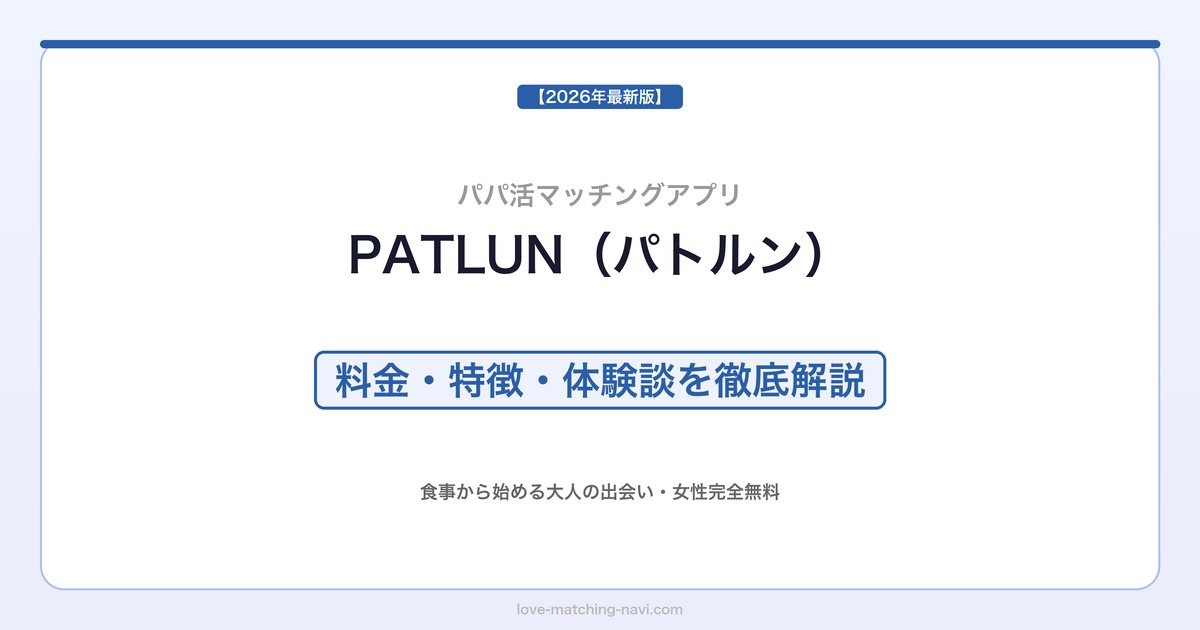 PATLUNは「食事から始める大人の出会い」をコンセプトにした2026年1月スタートの新しいパパ活アプリです。身分証確認後のIDデータ削除・写真匿名化など、プライバシーへの配慮が他サービスと差別化されています。女性は完全無料で始められるので、まずはPATLUNに無料登録してみるのをおすすめします。他のサービスとも比較したい方はマッチングアプリランキングもご覧ください。
