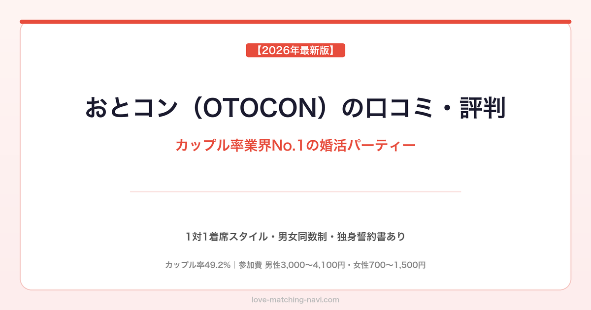 おとコンはカップル率業界No.1(49.2%)を誇る婚活パーティーサービスで、1対1の着席スタイル・男女同数制・独身誓約書提出という仕組みにより、真剣に結婚を考える人だけが集まる安心・安全な環境が整っています。この記事では、おとコンの特徴・料金・参加の流れ・口コミまで徹底解説します。