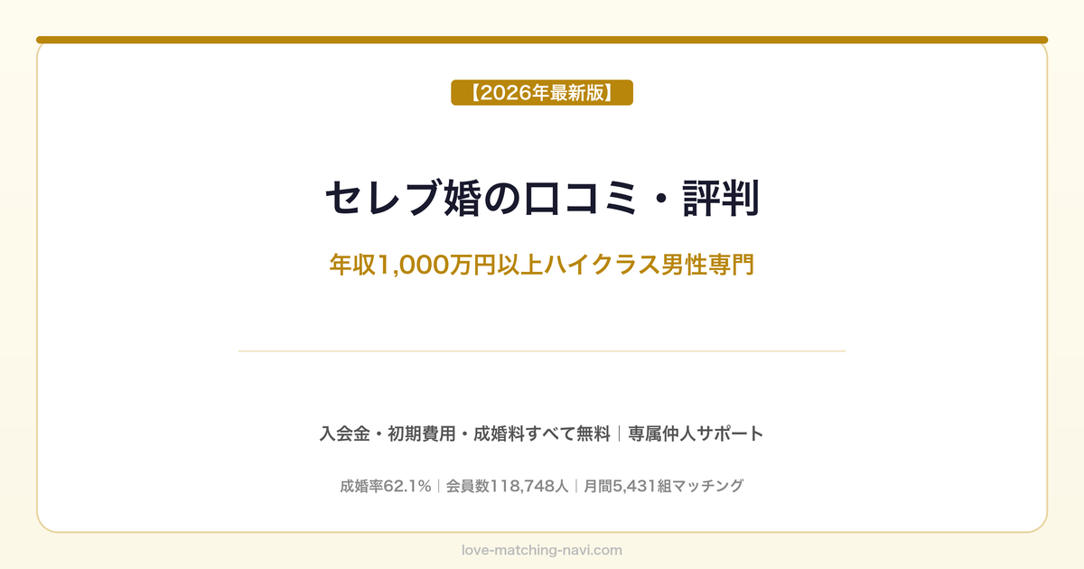 セレブ婚は医師・経営者・会社役員・投資家・金融マン・商社マンなど年収1,000万円以上の男性だけが登録できる婚活サービスで、会員数118,748人・成婚率62.1%という業界最高水準の実績を誇ります。さらに入会金・初期費用・成婚料がすべて無料という破格の料金設計も大きな魅力です。この記事では、セレブ婚の特徴・料金・口コミ・入会条件まで徹底解説します。
