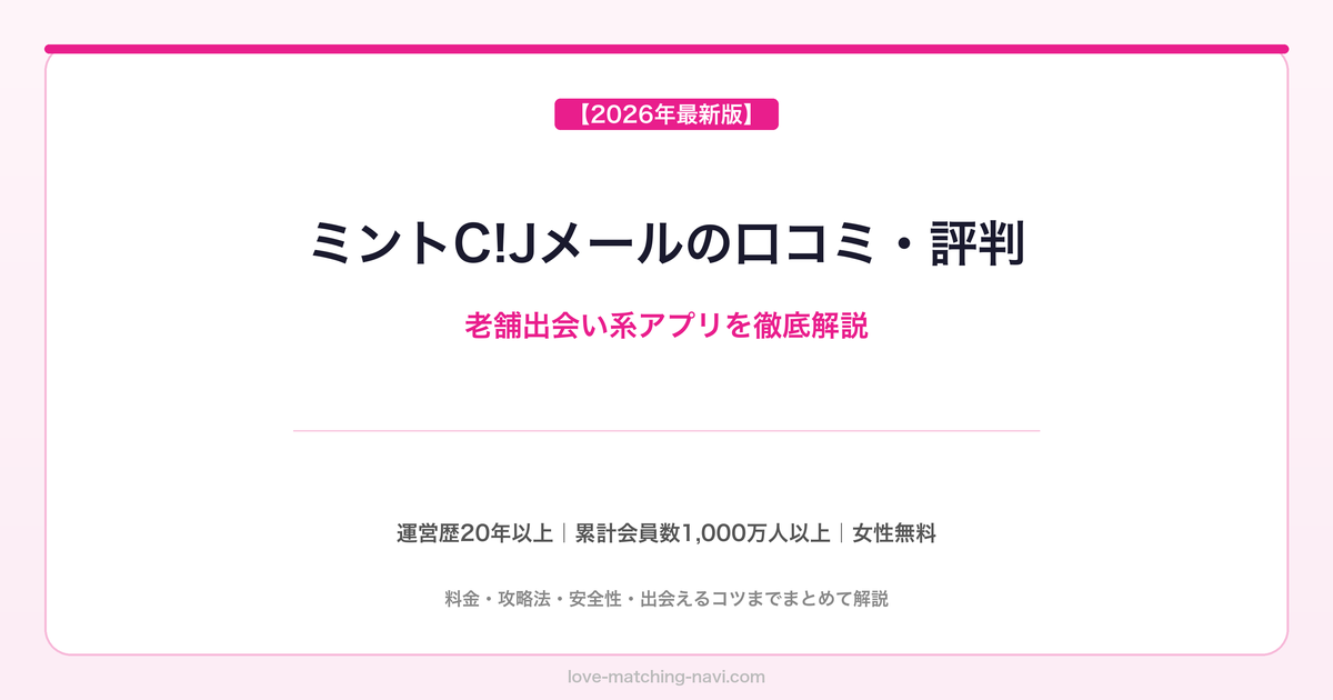ミントC!Jメールは運営歴20年以上・累計会員数1,000万人以上を誇る日本最大級の出会い系サービスです。女性は完全無料で使えるため女性会員が豊富で、「本当に出会えた」という口コミも多い一方、業者やサクラへの注意も必要です。この記事では、料金・使い方・攻略法・安全性まで徹底解説します。