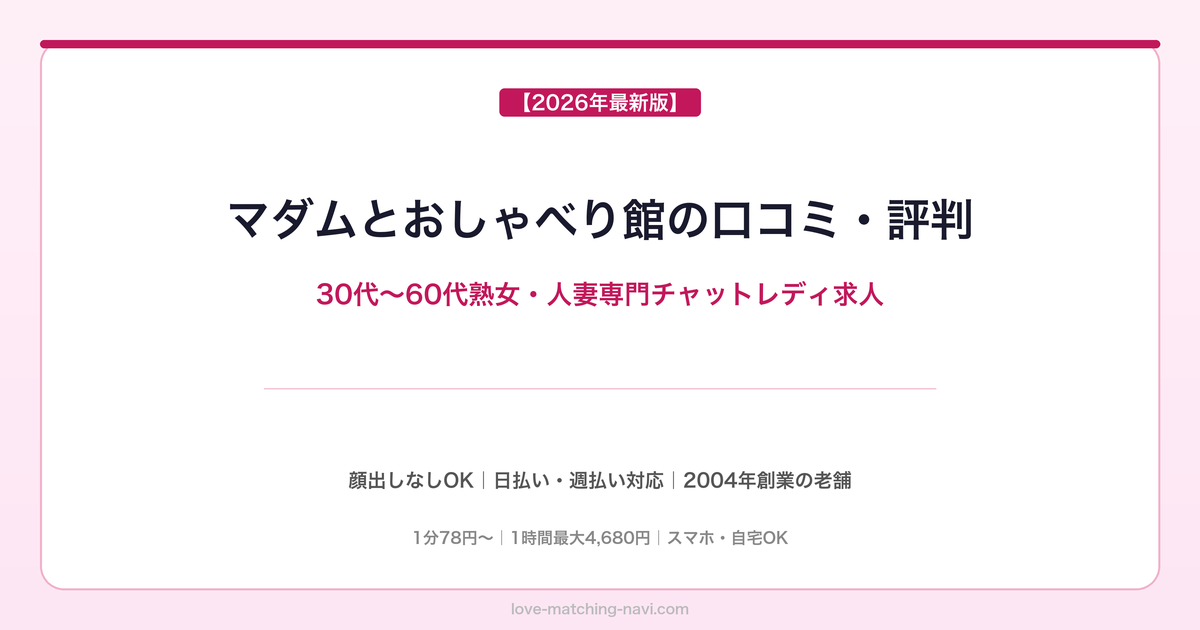 マダムとおしゃべり館は、30代〜60代の熟女・人妻・シングルマザーなどを主な対象としたチャットレディ求人サービスです。2004年の創業から20年以上の実績を持つ老舗で、働く女性の安心・安全にこだわった運営を続けています。
