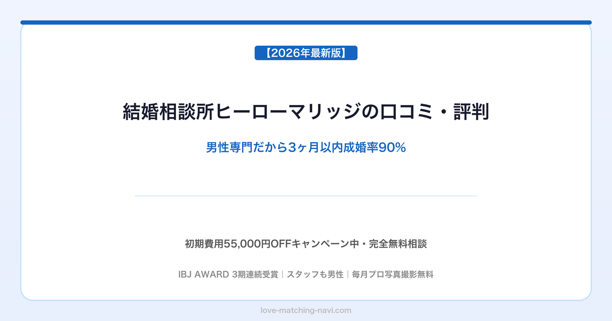 この記事では、ヒーローマリッジの特徴・料金・口コミ・他社との違いを徹底解説します。「3ヶ月以内成婚率90%」「IBJ AWARD 3期連続受賞」の実力の理由もあわせてお伝えします。