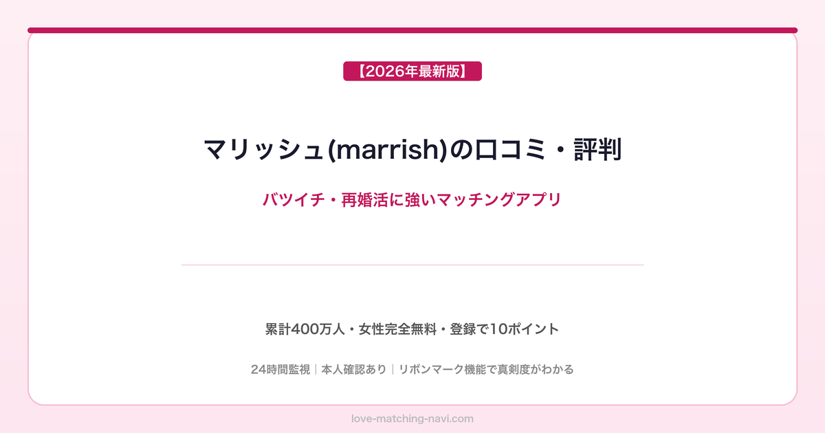 そんな悩みを持つ方に向けて作られたのがマリッシュ(marrish)です。再婚活・シンママ・シンパパを全力で応援するコンセプトのマッチングアプリで、累計400万人以上が利用・累計マッチング数1,000万組突破の実績を誇ります。この記事では、マリッシュの特徴・料金・口コミ・実際の使い方を徹底解説します。