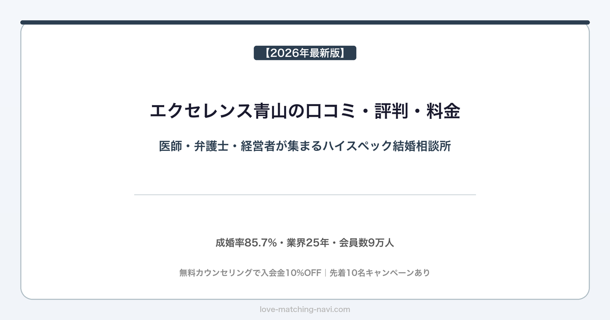 エクセレンス青山は成婚率85.7%・会員数9万人・業界実績25年・対面身元確認・専任カウンセラー制という婚活に必要なすべての条件を高いレベルで満たしている結婚相談所です。「医師・弁護士・経営者クラスの相手と出会いたい」「真剣に短期間で成婚したい」という方にとって、これ以上ない選択肢のひとつです。