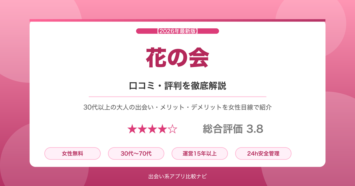 この記事では、花の会のリアルな口コミ・評判、料金、メリット・デメリットを徹底解説します。30代〜70代の大人の出会いを探している方はぜひ参考にしてください。