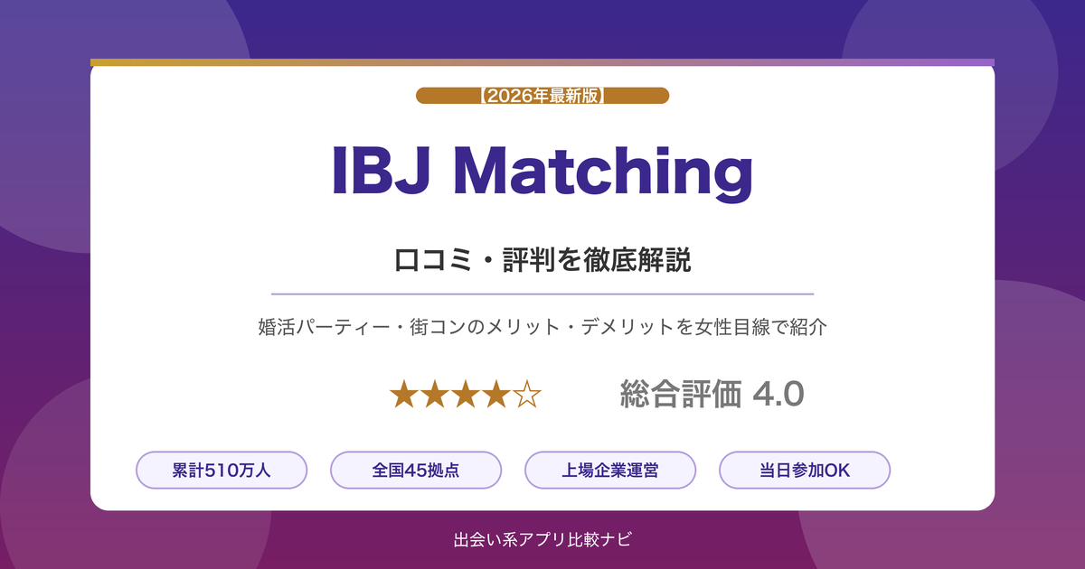 東証プライム上場企業・株式会社IBJが運営する婚活パーティー・街コンサービスで、累計参加者数510万人以上という圧倒的な実績。この記事では、IBJ Matchingのリアルな口コミ・評判、料金、メリット・デメリットを女性目線で徹底解説します。