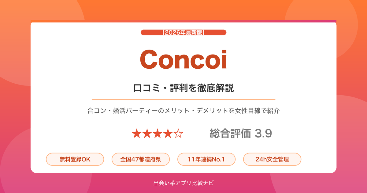 合コンと婚活パーティーの2つの形式で出会いをサポートするサービスで、11年連続No.1の実績・会員数34万人以上という人気サービスです。この記事では、Concoiのリアルな口コミ・評判、料金、メリット・デメリットを女性目線で徹底解説します。