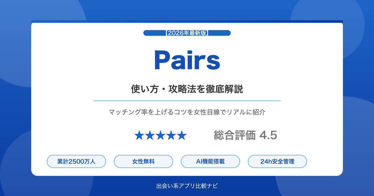 実は、Pairsは使い方のコツを知っているかどうかでマッチング率が大きく変わるアプリです。この記事では、Pairsの基本情報からマッチング率を上げる攻略法まで、女性目線でリアルに解説します。