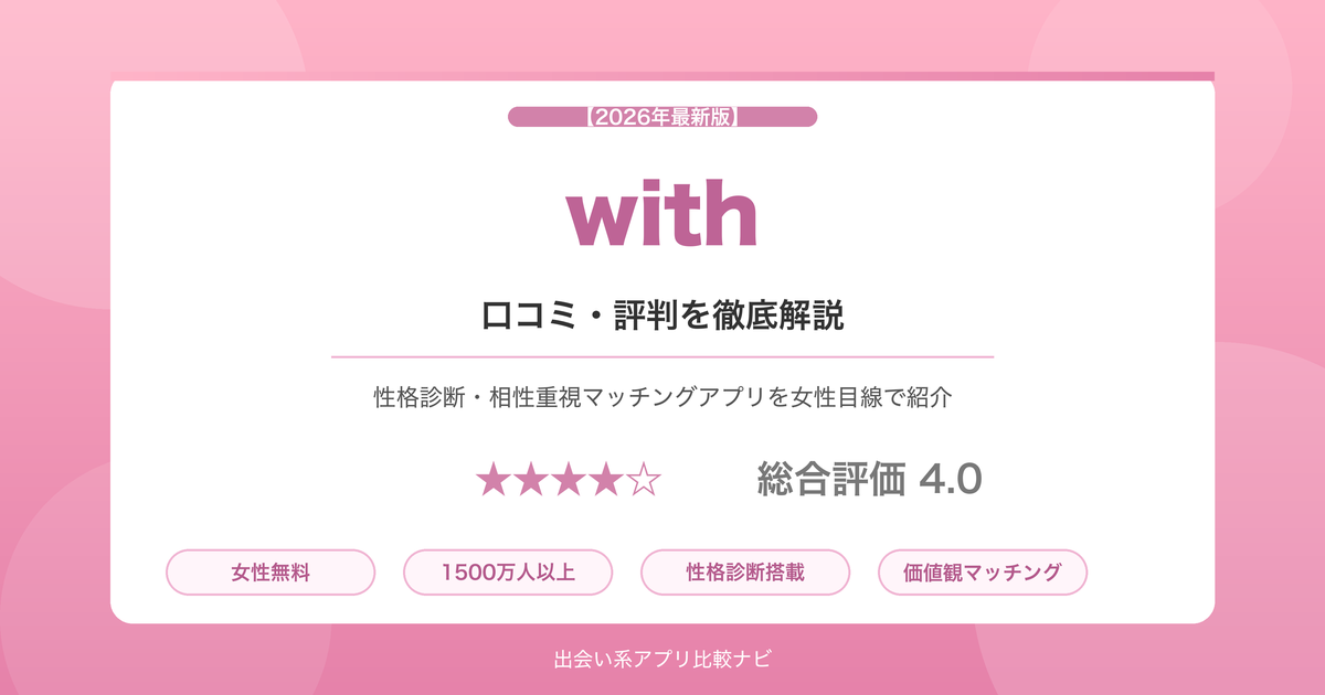 心理学をベースにした超性格分析・相性診断機能が特徴のマッチングアプリで、内面重視の出会いを求める方から支持されています。この記事では、withのリアルな口コミ・評判から料金・使い方まで女性目線で徹底解説します。