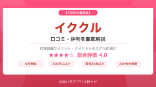 マッチングアプリ イククル 口コミ・評判【2026年最新】メリット・デメリットを女性目線で徹底解説 イククルの口コミ・評判を女性目線で徹底調査!メリット・デメリット・料金・安全性・他アプリとの比較まで2026年最新情報を詳しく解説します。 2026.01.07 マッチングアプリ